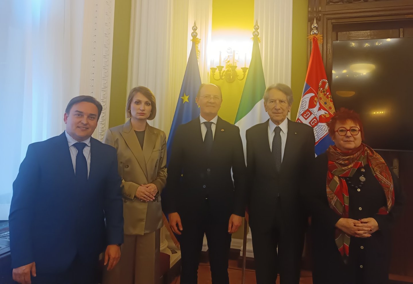 Председник ПГП Јован Палалић оценио је да су парламентарни односи Србије и Италије на високом нивоу, којима је снажан замах у претходном периоду дала председница Народне скупштине. Он је додао да су укупни политички односи двеју држава, а по личној оцени, на највишем нивоу у последњих 100 година, чему је допринела сарадња између председника Србије и председнице италијанске Владе. Палалић је захвалио италијанским колегама на позицији Италије као земље која жели да саслуша српску страну и поручио да је својим „меким приступом“ успела да придобије симпатије народа на Балкану. Он је указао на драматичну ситуацију у којој се налази српски народ на КиМ, који је изложен неподношљивим условима и суочен са животом у гету. Председник ПГП истакао је важност отварања Кластера 3 у преговарачком процесу о приступању Србије ЕУ и проблему неконзистентности саме ЕУ у том процесу, а такође се осврнуо на EXPO 2027 и изразио захвалност што ће Италија учествовати на овој манифестацији.